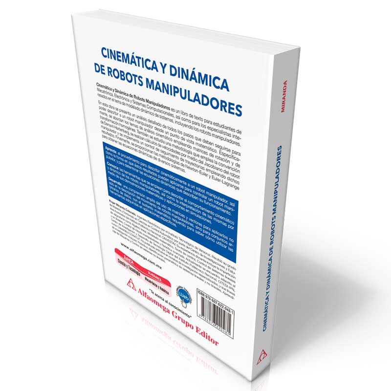 Esta obra, dividida en cinco capítulos, está dirigida especialmente a los estudiantes de Mecatrónica, Electrónica y Sistemas computacionales que deseen adentrarse en el tema del modelado dinámico de sistemas, incluyendo los robots manipuladores, y desarrolla cinco temas principales: el uso de sistemas de referencia para describir un cuerpo en el espacio, las matrices de rotación y de transformación homogénea, la cinemática directa empleando la convención de Denavit-Hartenberg, el Jacobiano de un robot manipulador, el tensor de inercia y las ecuaciones de Newton-Euler y Euler-Lagrange.