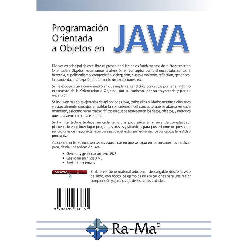 “El objetivo principal de este libro es presentar al lector los fundamentos de la Programación Orientada a Objetos. Focalizamos la atención en conceptos como el encapsulamiento, la herencia, el polimorfismo, composición, delegación, clases envoltorio, reflection, genéricos, lanzamiento, intercepción, tratamiento de excepciones, etc.