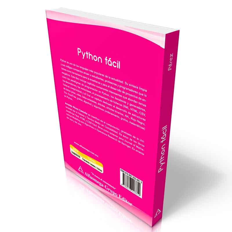 El lector encontrará en estas páginas una guía que compagina teoría y práctica en igual proporción, descubrirá las ventajas del uso de Python frente a otros lenguajes como PHP, JAVA, y CSharp; conocerá los elementos que componen su estructura sintáctica concisa y clara, así como sus componentes léxicos: los tokens, literales, delimitadores, las sentencias y palabras clave, variables de entorno, tipos de datos, secuencias de las que se vale y las operaciones que pueden realizarse, por ejemplo las llamadas tuplas; es decir, obtendrá las herramientas necesarias para ejercitar y dominar la programación orientada a objetos.